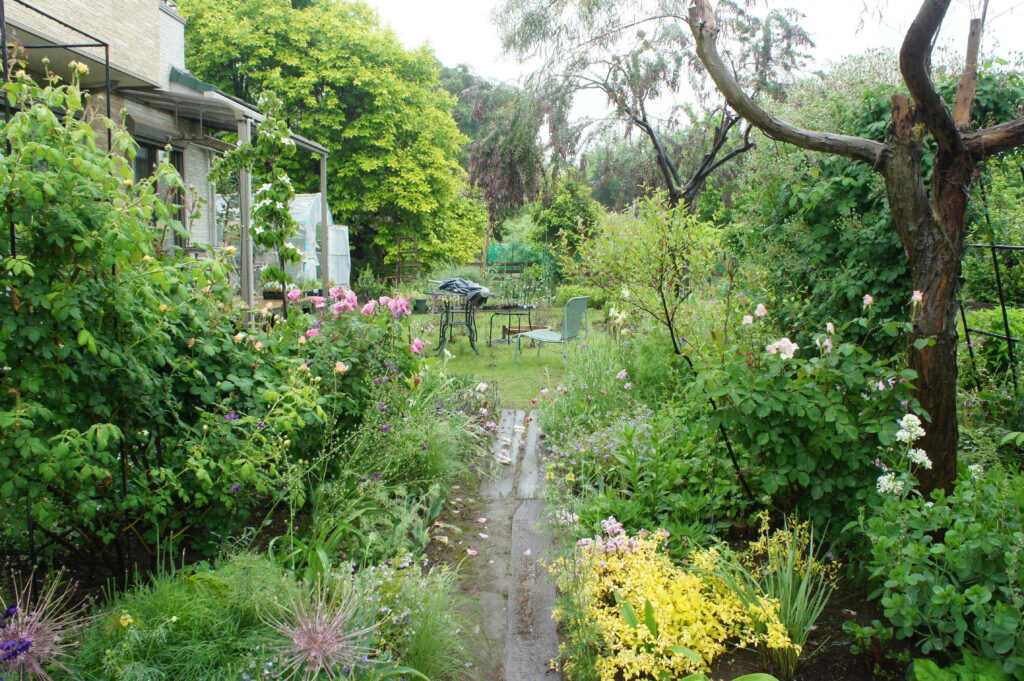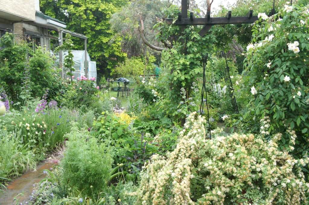 藤田さんの庭を初めて訪れたのは2016年で北本オープンガーデンを開始した年でした。藤田さんはエステサロンを始めるに当たって実家の土地の1画に家を建て広大な野菜畑をイングリッシュガーデンにしようと試み3年経った時期でした。スペースが広いため宿根草も含めて草花の大半は種子撒きで栽培し、薔薇や立ち木やお父さんに作って貰ったパーゴラで空間を構成していました。私もまったくガーデニングの素人で短期間で草花や薔薇にのめり込みましたが、藤田さんの庭はスペースが広く草花で埋めるのが容易でなく、良く3年で仕上げたものだと驚嘆しました。また草花や植物の探求のエネルギーは尋常でなく、やがては趣味だけでは終わらない予感はしていました。