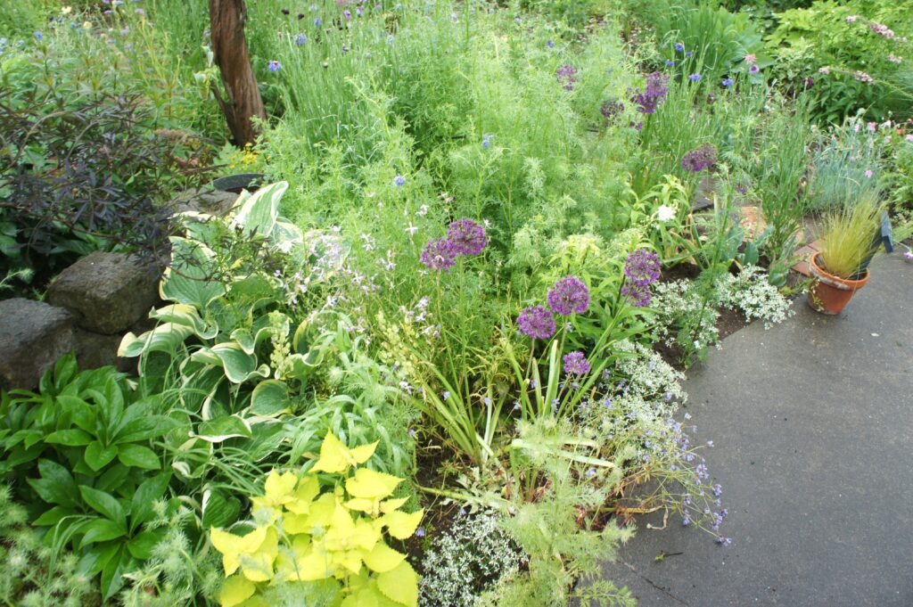ガーデニングを始めた頃、球根草花のギガンチウムの袋を見て、個人の庭でこんな花を植える場所があるのだろうか・と想ったことがありました。当時自分で栽培した事の無い花なら何でも欲しくてしばらく手に取っていましたが、庭植えでないと様になりそうにもないので諦めましたが、藤田さんの庭を初めて訪れた時、真っ先にギガンチゥムの紫の玉が眼に入ったことを覚えています。