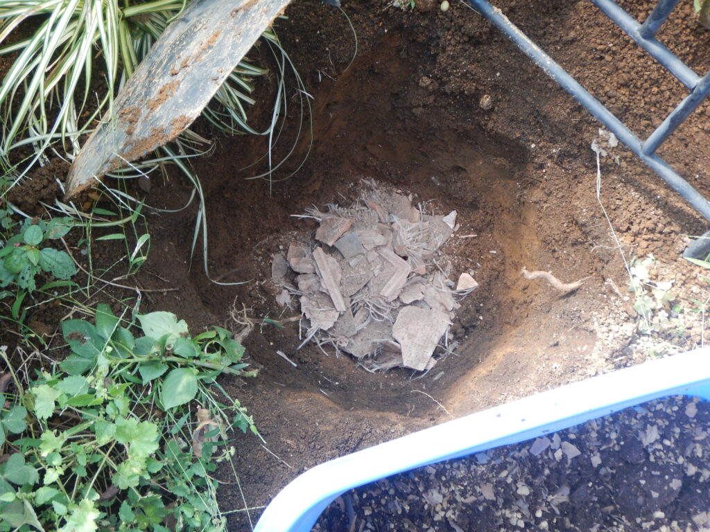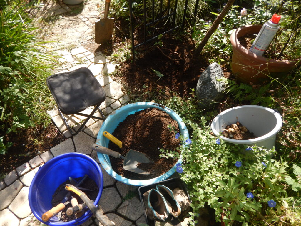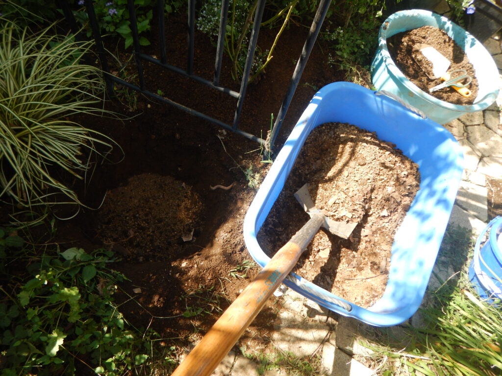 まずバレリーナを抜き隣の植穴に、バレリーナが植えてあった土壌と共に移殖しました。余った土壌は庭の別な位置に撒きました。次にレイニー・ブルー用に植穴をたっぷりと50センチ以上の深さに掘り、径も50㎝を遥かに超えた大きさで掘りました。