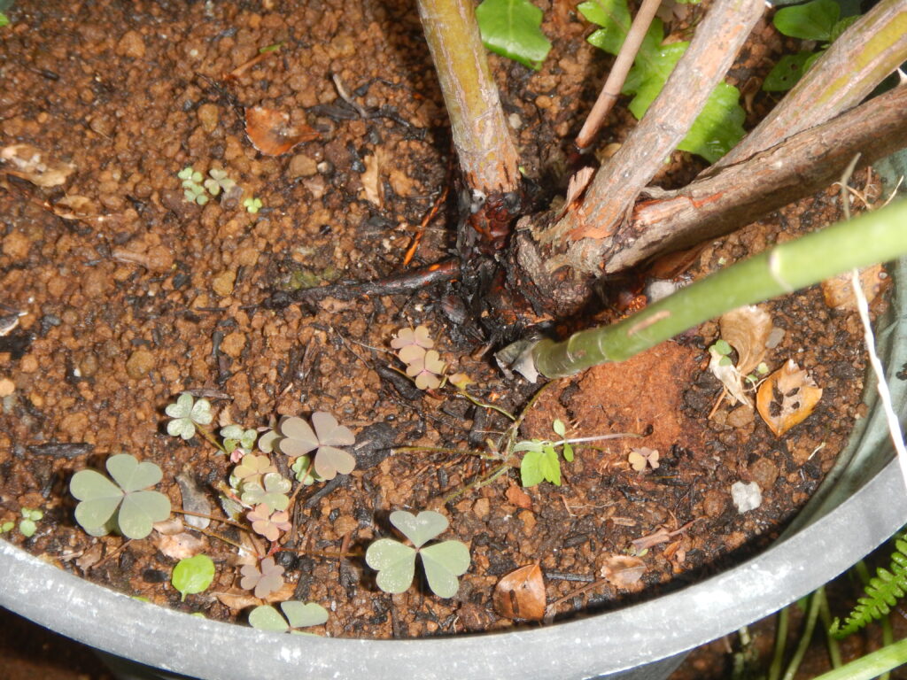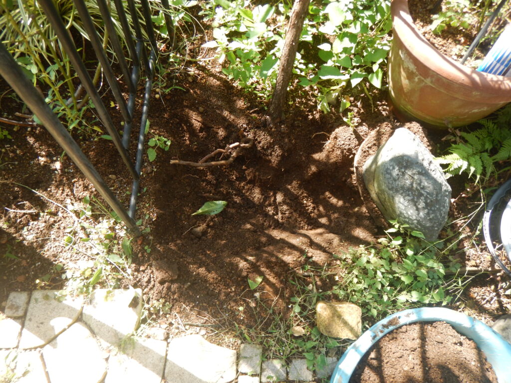 最初に可哀そうだけどカラミンサが伸び伸びと育っている場所に、カラミンサを抜きバレリーナのための植穴を掘りました。穴を掘ると直ぐレーヌ・ヴィクトリアの根が現れます。