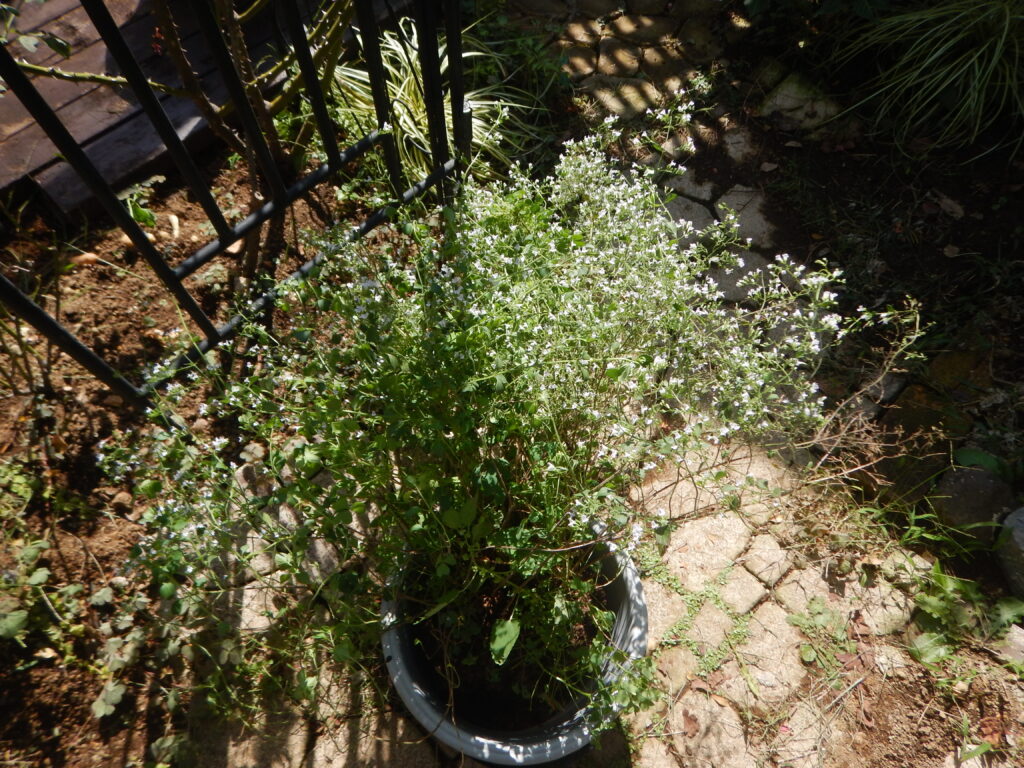 中央が新たに植えたレイニー・ブルーでガゼボの奥が移植したバレリーナ、更に奥に移動したカラミンサです。