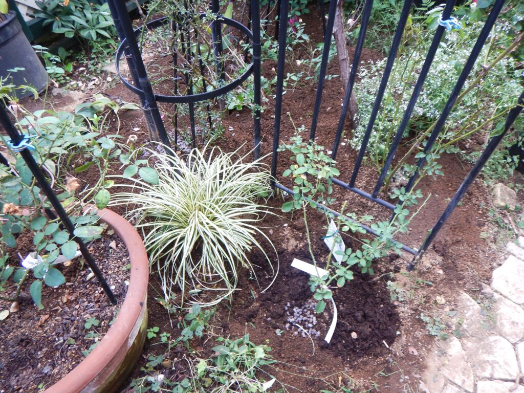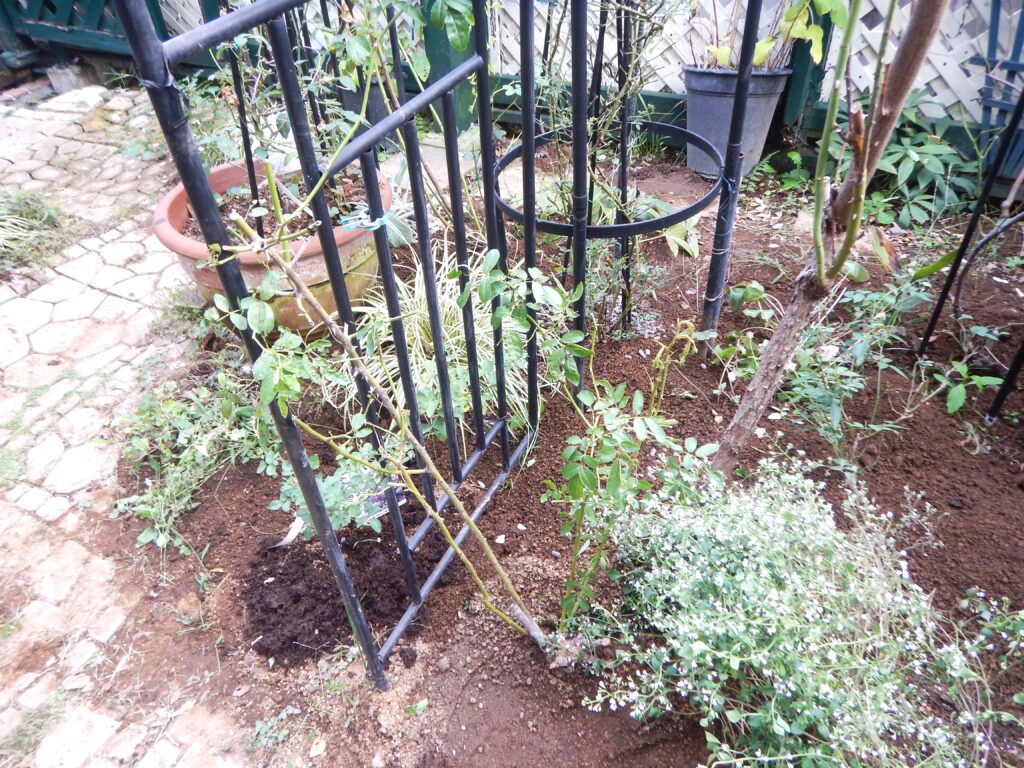 ガゼボ周辺に植えようとしましたが、狭い庭の哀しさで、もう植える場所がなく、しかたがないので、嫌地の障害を承知で既存の薔薇を移設して植えることにしました。