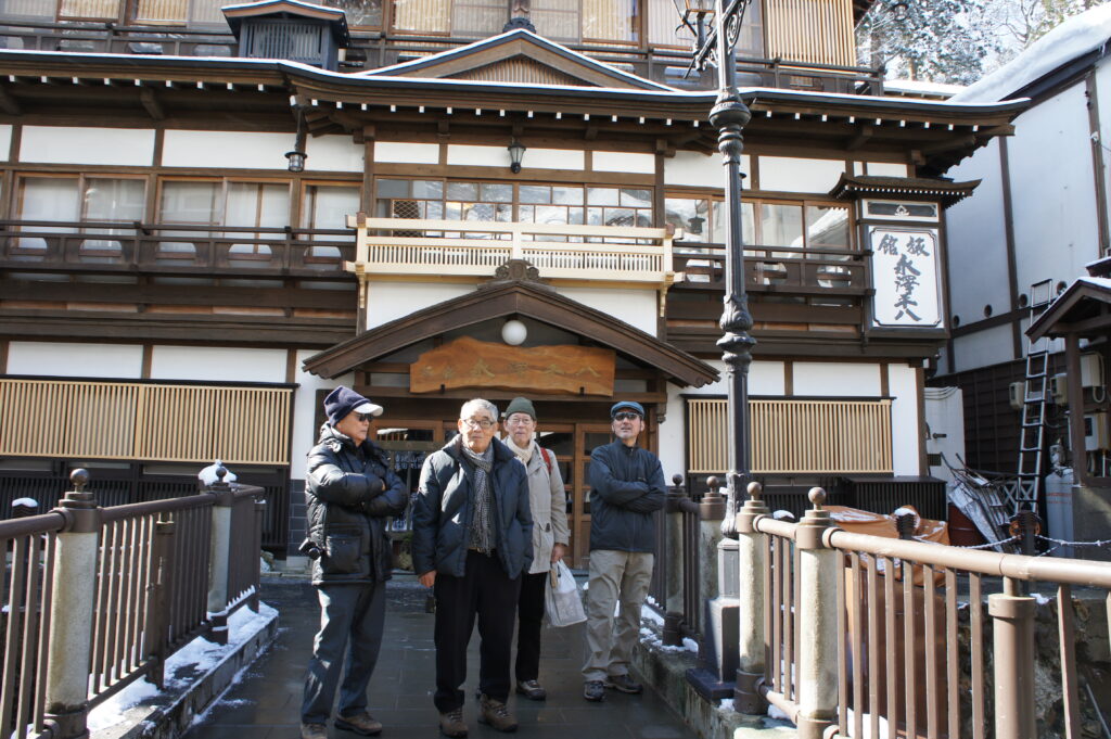 彼は大男で山にも強かったのですが、1年の11月、乗鞍の雪上訓練合宿で雪崩に埋まり4年生も亡くなりましたが、それ以来沢登りが主で雪山にはあまり熱心でなくなりました。60過ぎて、同期の山は同行しませんでしたが、江戸の史跡や、日本のあちこち旅を行いました。雪の最上川船下りを行った後、銀山温泉に泊まり蔵王に行きました。