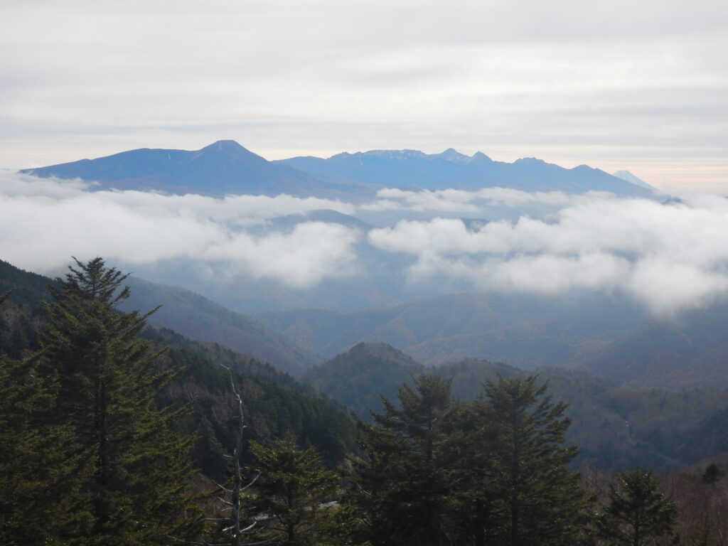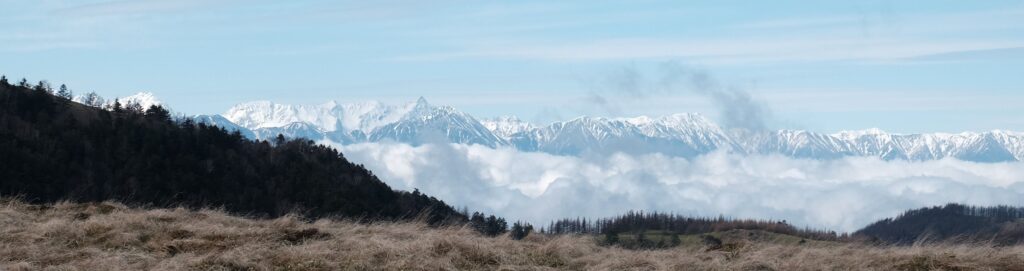 白く横たわる峰々は北アルプスの槍ヶ岳、常念岳、大天井岳、燕岳の峰々です。