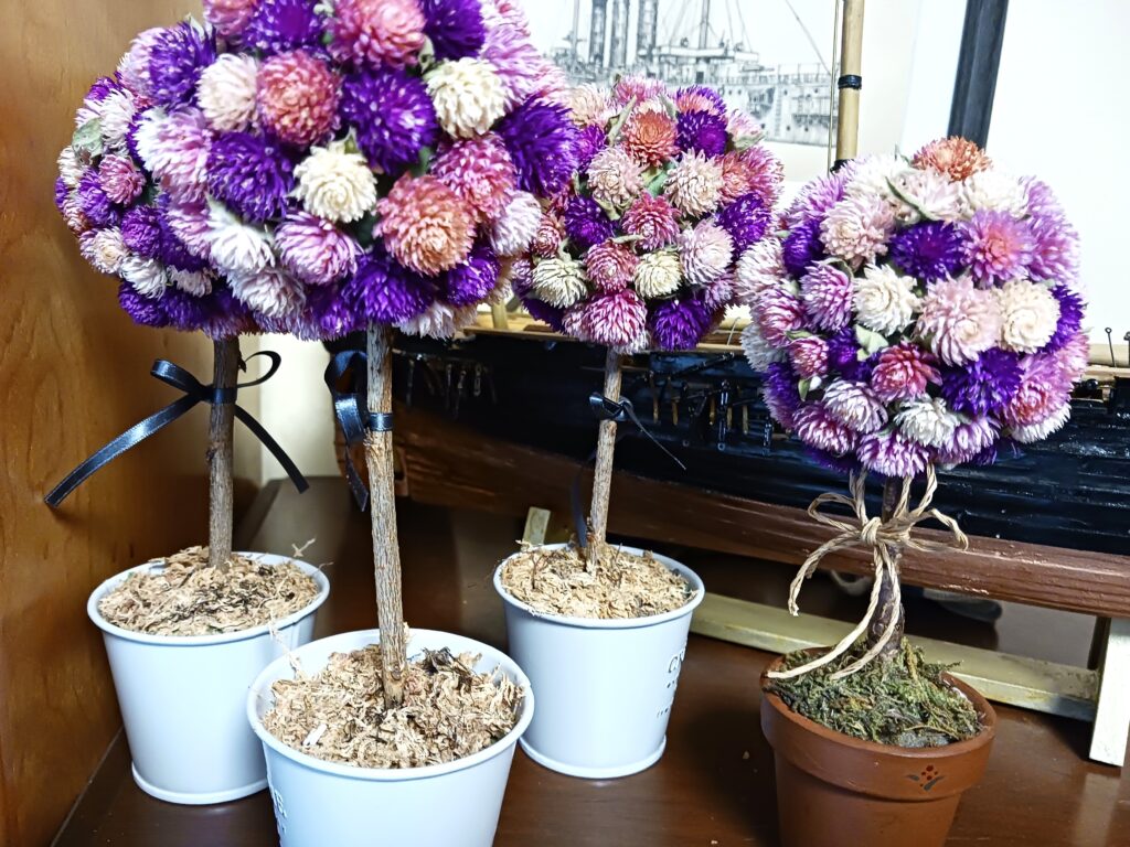 家内は千日紅のトピアリーづくりを長い間行っており、知り合いの人にプレゼントしています。
