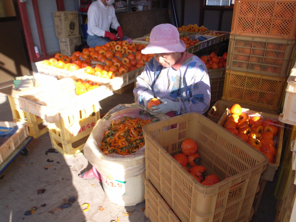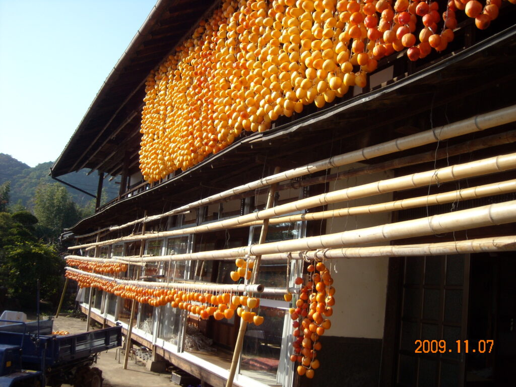 1軒の柿農家で干し柿つくりを見学させていただきました。柿はこの辺りの名産の巨大な甲州百目柿で、作られた干し柿は高級品のため家の近くのスーパーではお目にかからない代物でした。私はかねてから今わの際には柿を食べようと想っていて、その事を柿づくりに忙しいお婆さんに言ったら、お爺さんもそうだったと言って、大きな柿を1個頂いてしまいました。