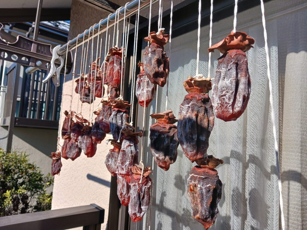 完成した干し柿です。手前に干したあの片手に余るほどの大きさの蜂屋柿(甲州百目柿)もこんなに小さくなってしまいました。