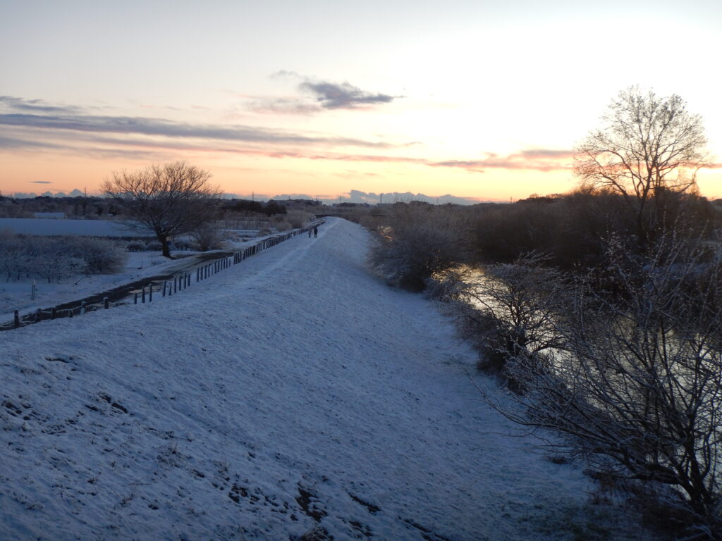 さすが凍り付いた滑る道を辿って初日の出を見に来る人はいません。土手の遠くに初日を待っている人がいます。