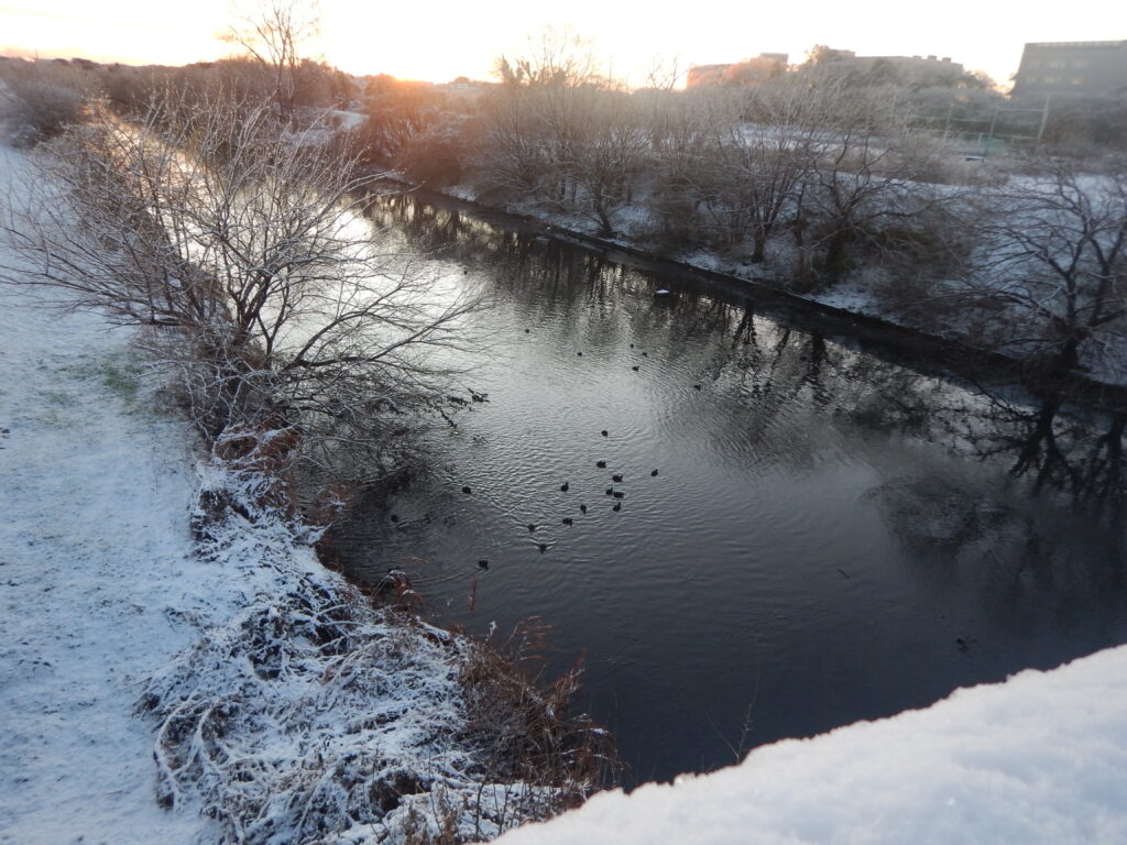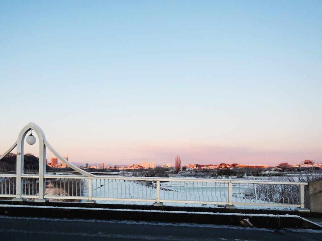 前夜降った雪が、凍ってガリガリになった道を橋の上までやってきました。この日は用心のためストックを持参しました。