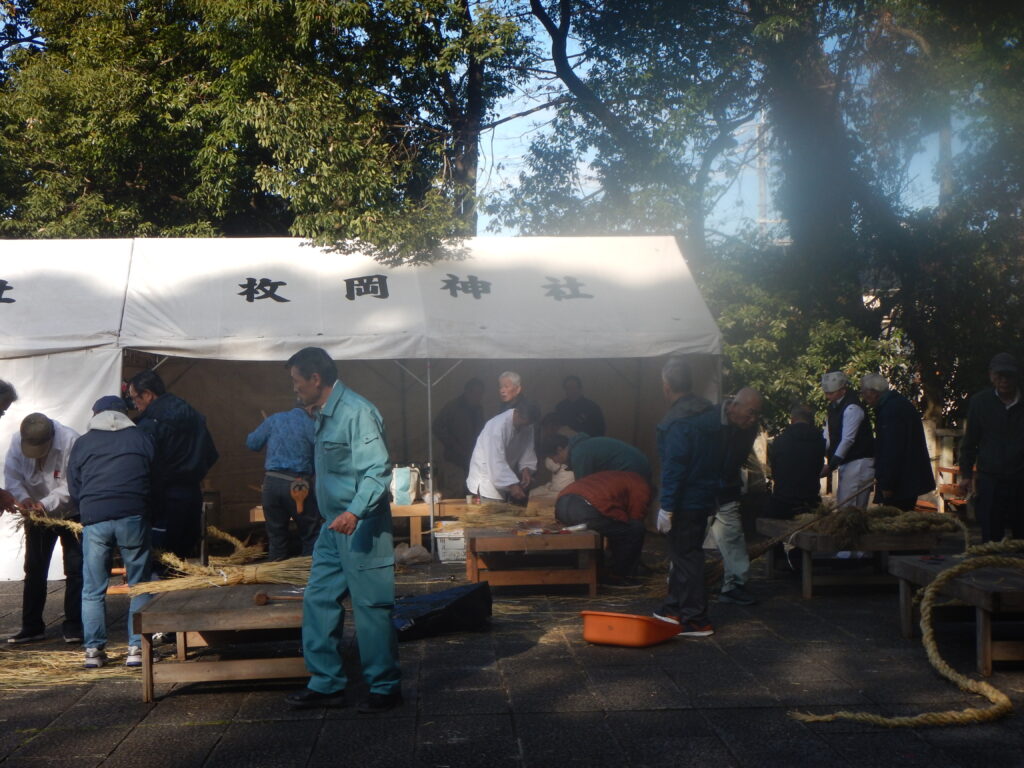 枚岡神社の氏子の人たちが、初詣に神社を飾るしめ縄づくりに余念がありません。