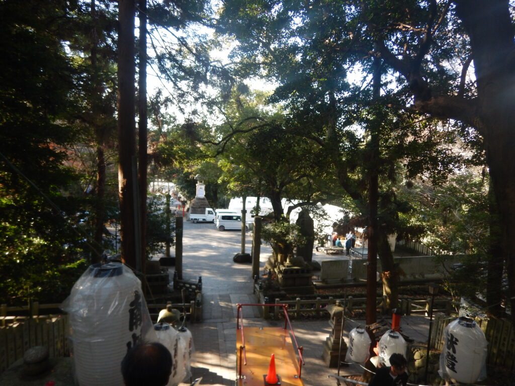 この右手の坂の下にかなり広い駐車場があります。奈良や大阪は車社会なので、神社や寺はしっかり駐車場を確保しています。
