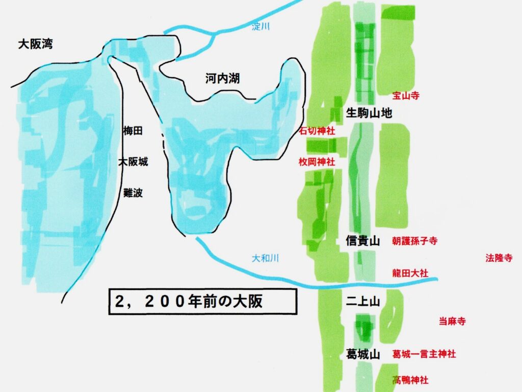 やがて江南から九州や吉備などに集団で移住し水耕栽培を行っていた海人族たちはより広い耕地を求めて大阪湾に至り、河内湖を横切って生駒山の麓に定住し始めたと仮定します。