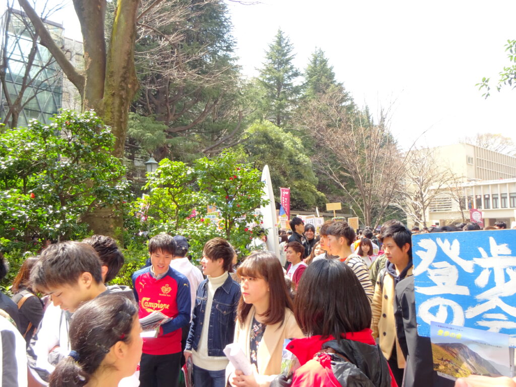 今でもサークル勧誘日は何日かあり構内は人が歩けなくなるほど盛況です。早稲田の最大の特徴は旧帝国大学のように校舎も多く少数で勉学を行う大学と異なり、豊富なサークルに身を置いて、多くの個性の強い仲間と切磋琢磨して人間力を磨くことにあります。昔総長は早稲田は芋洗い器だといっていました。清流に設置した芋洗い器に芋を投げ入れ、水の力で回転しながらお互いに芋をぶつけ合いながら自然に皮を剥く古来の道具ですが、良く表現されています。