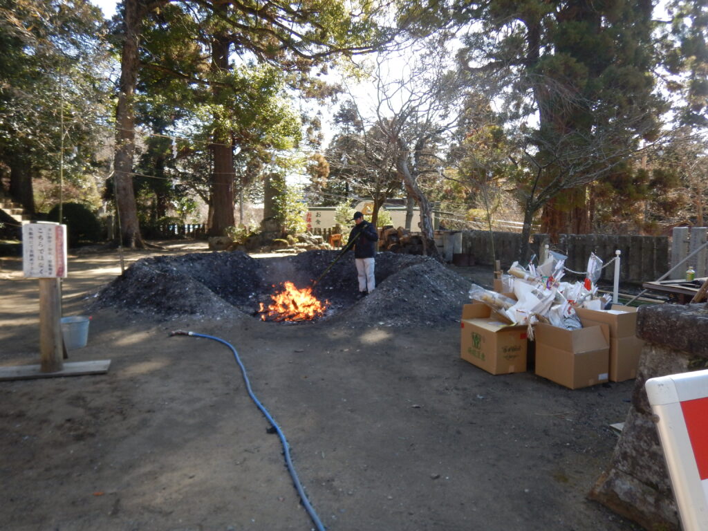 お札のお焚き上げを行っています。古いお札のお焚き上げは、大体が年末か新しいお札を発行した時に納められた古いお札をお焚き上げするものですが、量が多いため今も行っているのでしょう。お焚き上げは良い風景です。