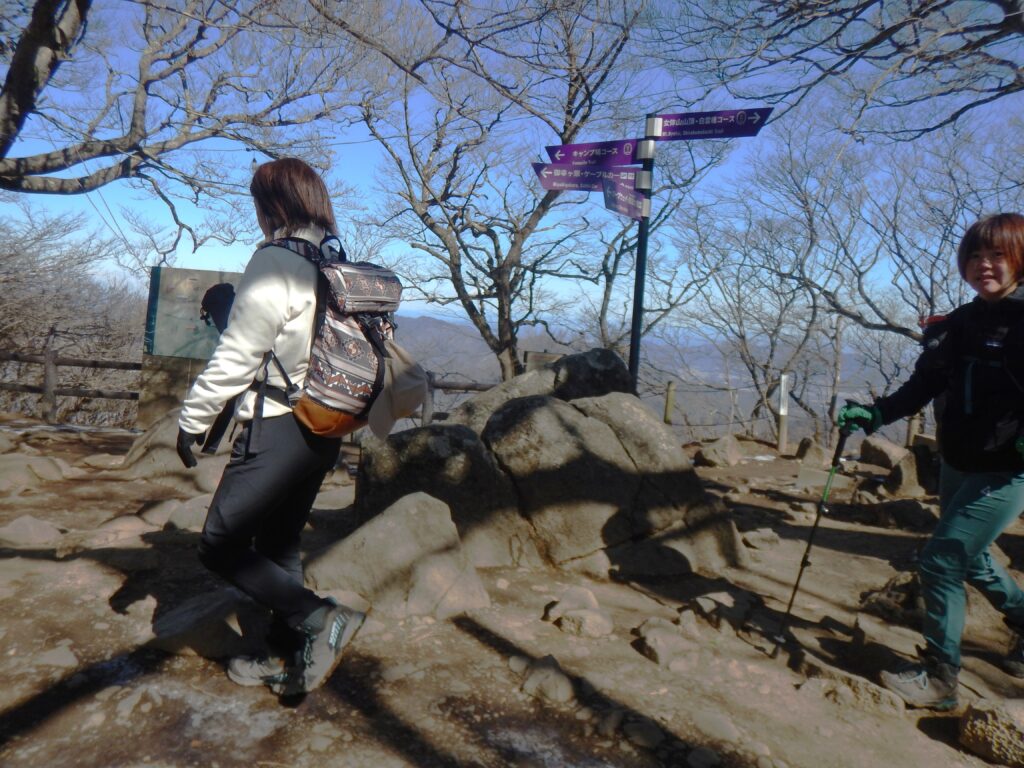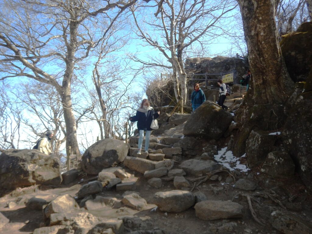 鞍部から女体山ピークまで12分程度ですが、角がすり減った岩は蛇紋岩のように良く滑る岩道です。班れい岩と云うそうです。まだ雪が残り日陰の道は凍り付いているので、みな難儀しています。