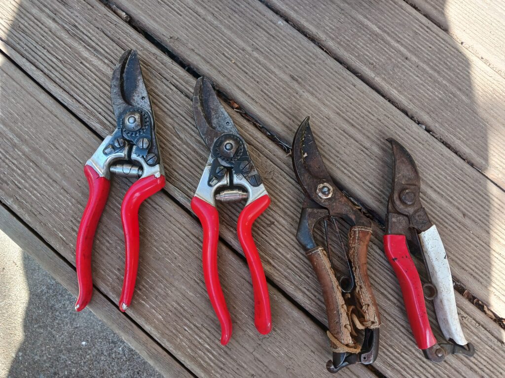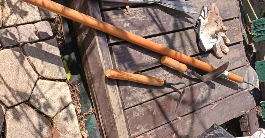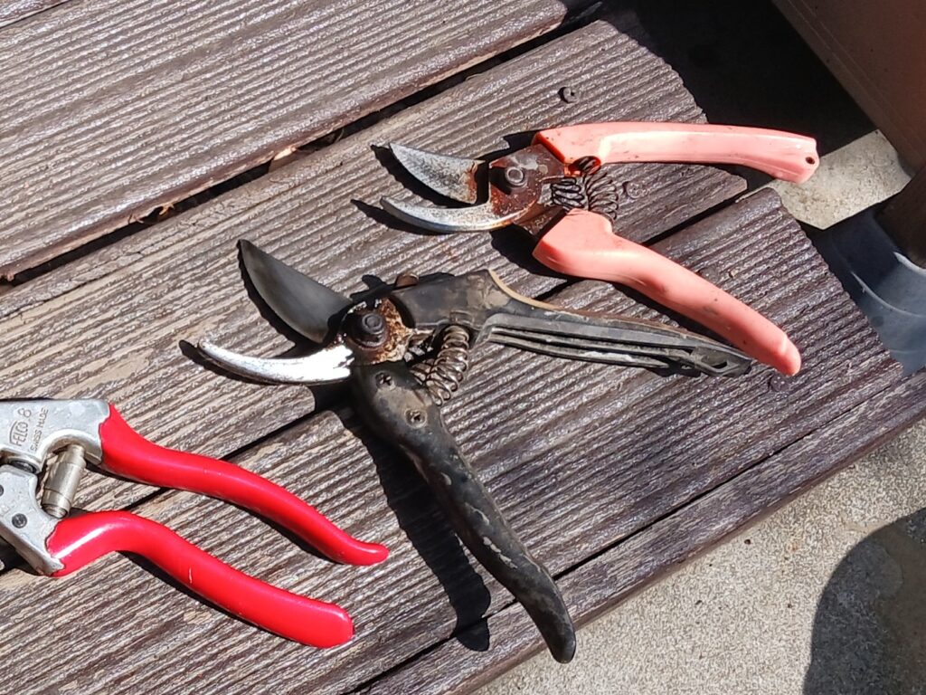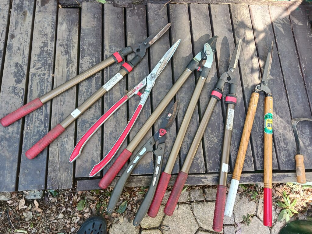 特に左から2番目の刈込ばさみは家庭菜園の用水の道路際で、雑草取りに使用します。地面が固く雑草堀りは不可能になったため、シーズン中は雑草を刈り込んで巨大化しないようにする不毛な作業に使用しています。公道のため本来は市の作業と想います。