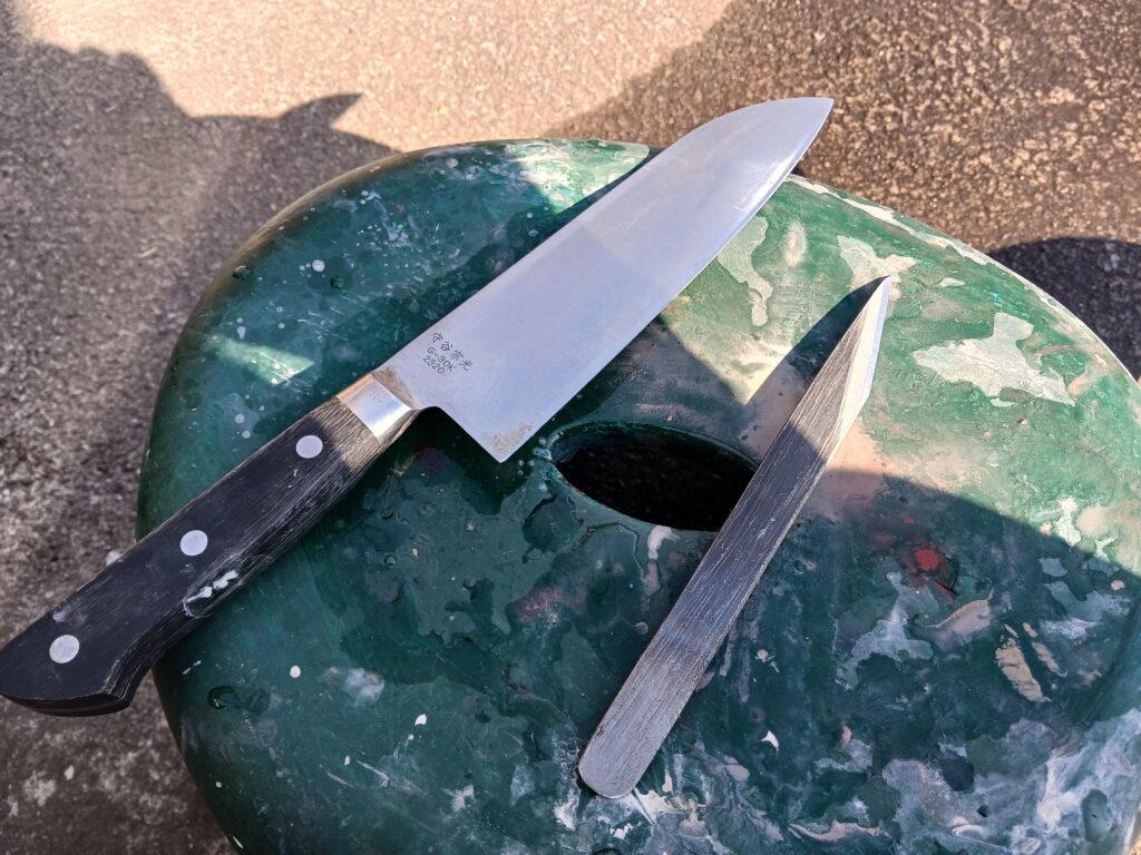 ついでに草刈り鎌も研ぎます。立ち鎌はステンレスで手鎌は鍛造です。真ん中のねじり鎌は佐久の道の駅で購入した鍛造もので研ぎに耐えられる製品で一番愛用しています。