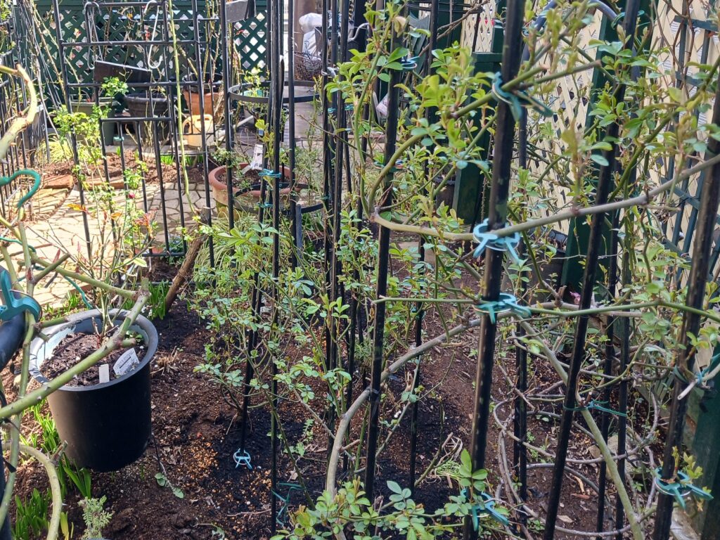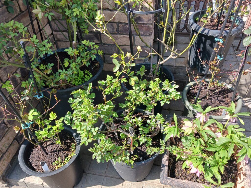 薔薇の芽吹きが始まりました。こちらは全て早い方の薔薇です。