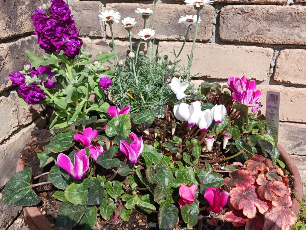 寄せ植えはどうしても冬の寒さで痛むため、傷んだ植物は花壇に植え替え新しく補充します。ガーデンシクラメンも古い葉を取り除き、隠れた蕾や新しい葉が伸びる様にしました。