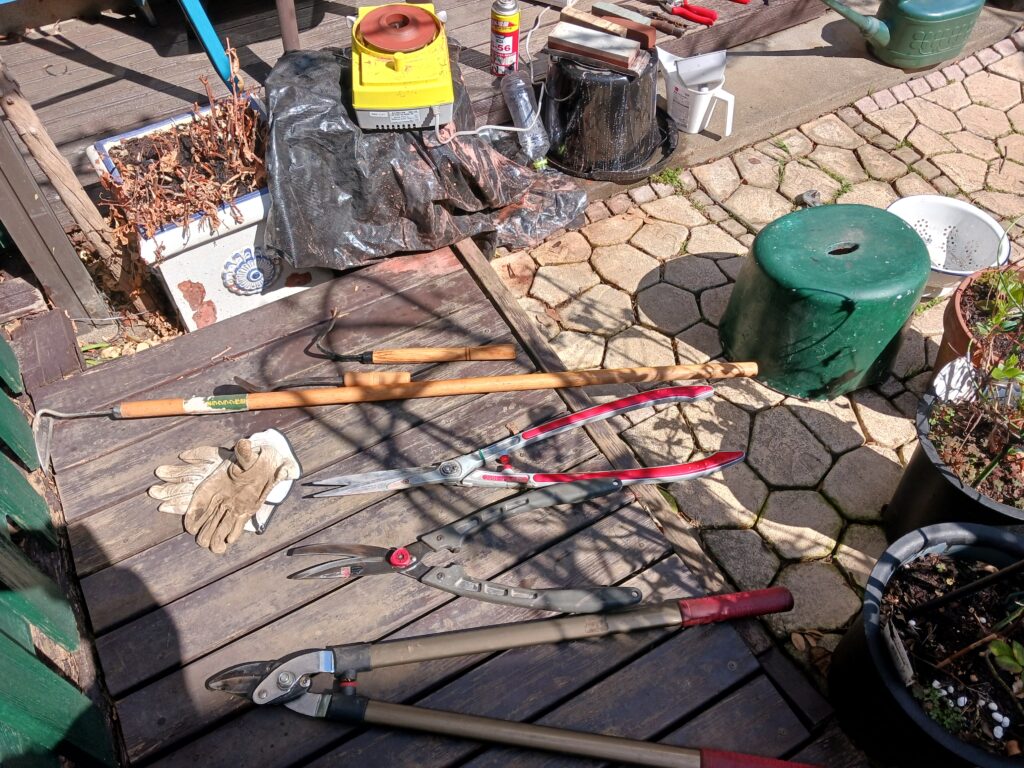 園芸挟みの研ぎ作業は、作業場や納屋でもあれば常時設置でき思い立った時すぐできますが、狭い庭だと水を使用する研ぎの道具のセットが面倒なためつい後回しになっています。