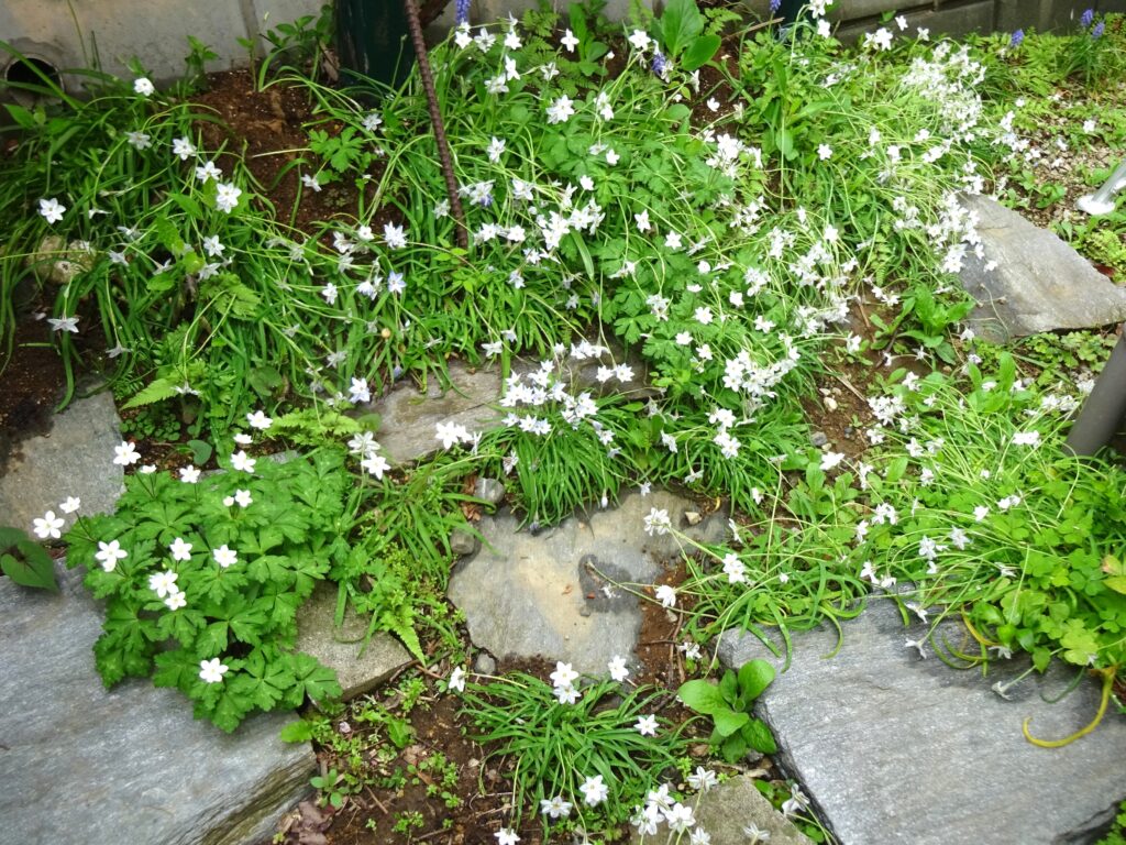 このスペースは二輪草を植えたのか記憶がありませんが、春になると二輪草が群生し、我が家で唯一手つかずの自然を感じさせてくれるスペースになっています。ハナニラも植えた記憶はありませんが、鳥が運んできたのでしょうか?