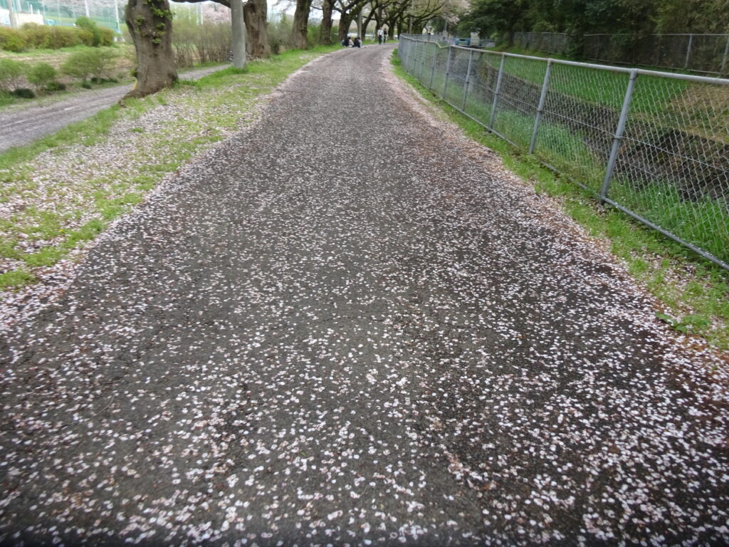 今年の花吹雪は実に見事でした。特に6日は前日大雨が降ったこともあり、土手の通路は見事な花の絨毯で覆われ、用水は花びらがよどむことなく増水した川の早い流れに乗って