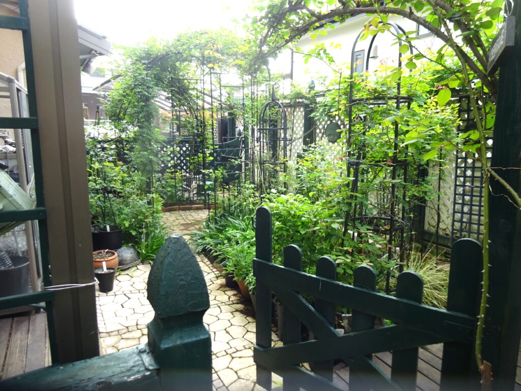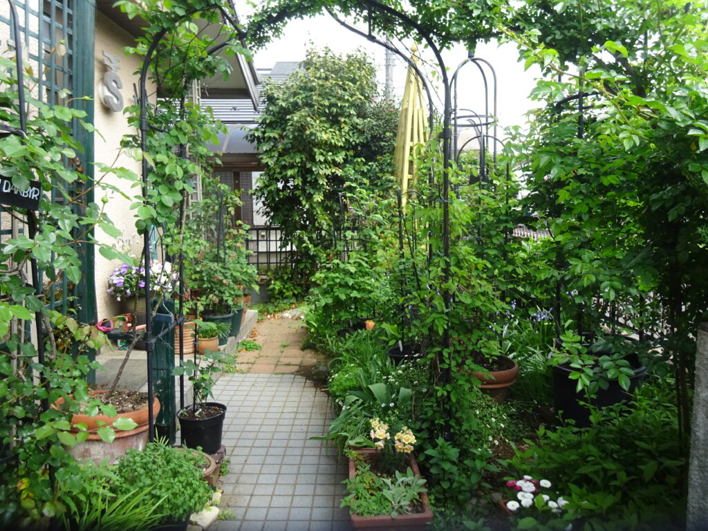 主庭は前庭と比べて日照が悪く、家屋側を除いて冬の間はほとんど陽があたりませんが、3月から当たり出し茂ってきます。
