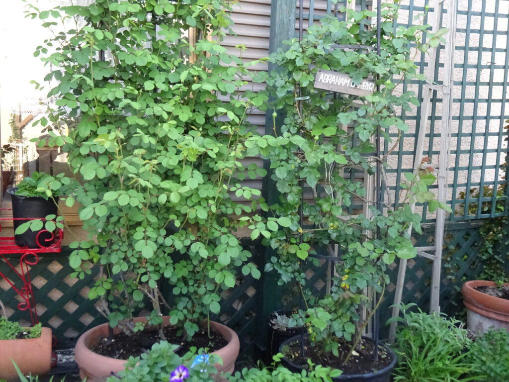 いつも最初に咲いてくれる大型薔薇、イングリッシュローズのエイブラハム・ダービーとウイズリー2008。エイブラハム・ダービーは30年近く前、最初に購入したイングリッシュローズの1本で、特に愛着があります。