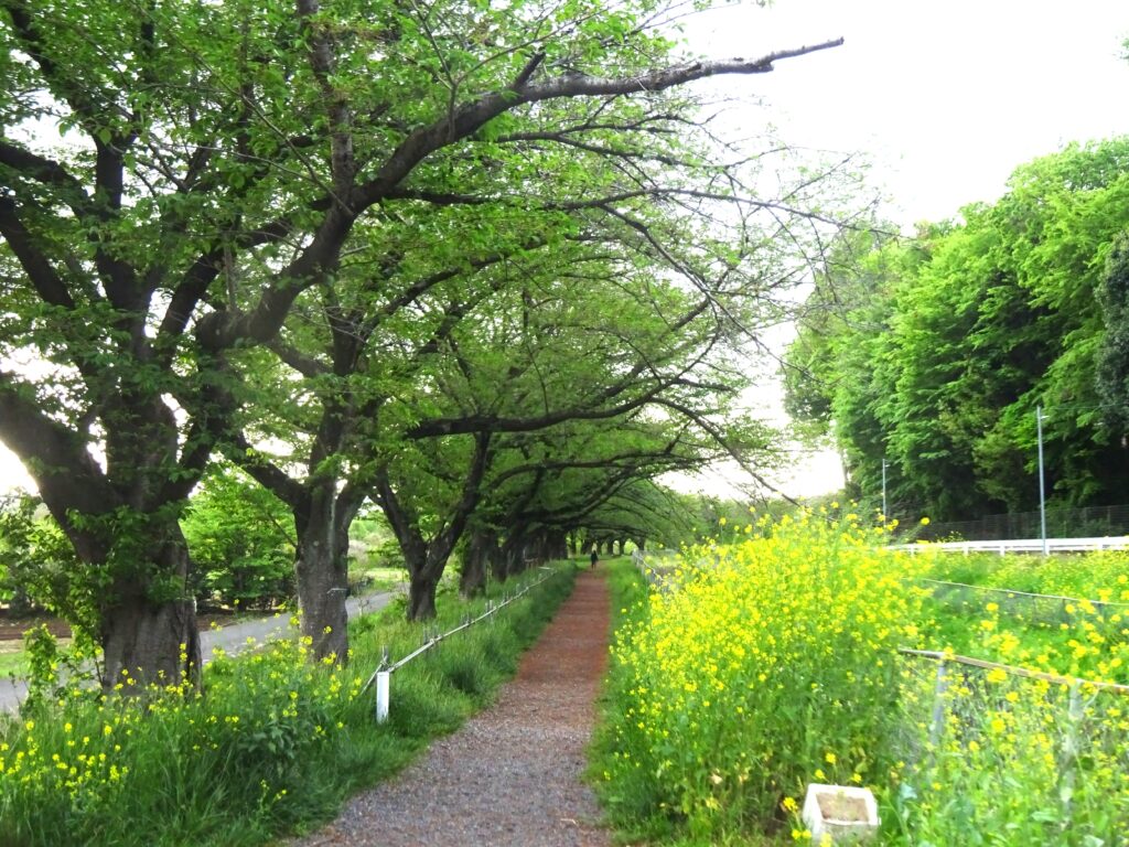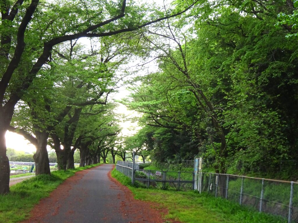 桜が終わると見沼用水沿いは新緑の季節になります。桜の新緑も良いですが、対岸の見沼斜面林の常緑樹の新緑も見事です。