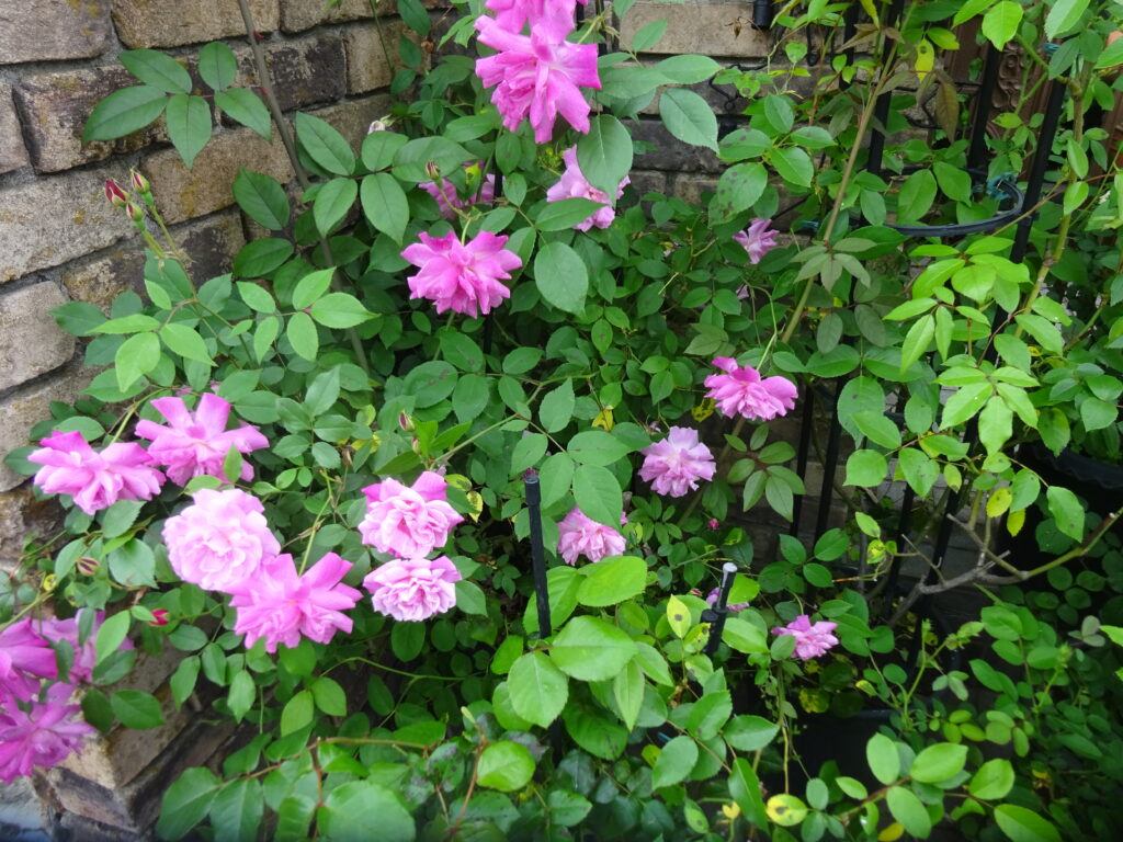 今年剪定に気合を入れたパーゴラの薔薇が、良く茂ってきました。ヴィオレットとフェアリーの変種、プロスペリティとクリシュチアーナのコラボです。