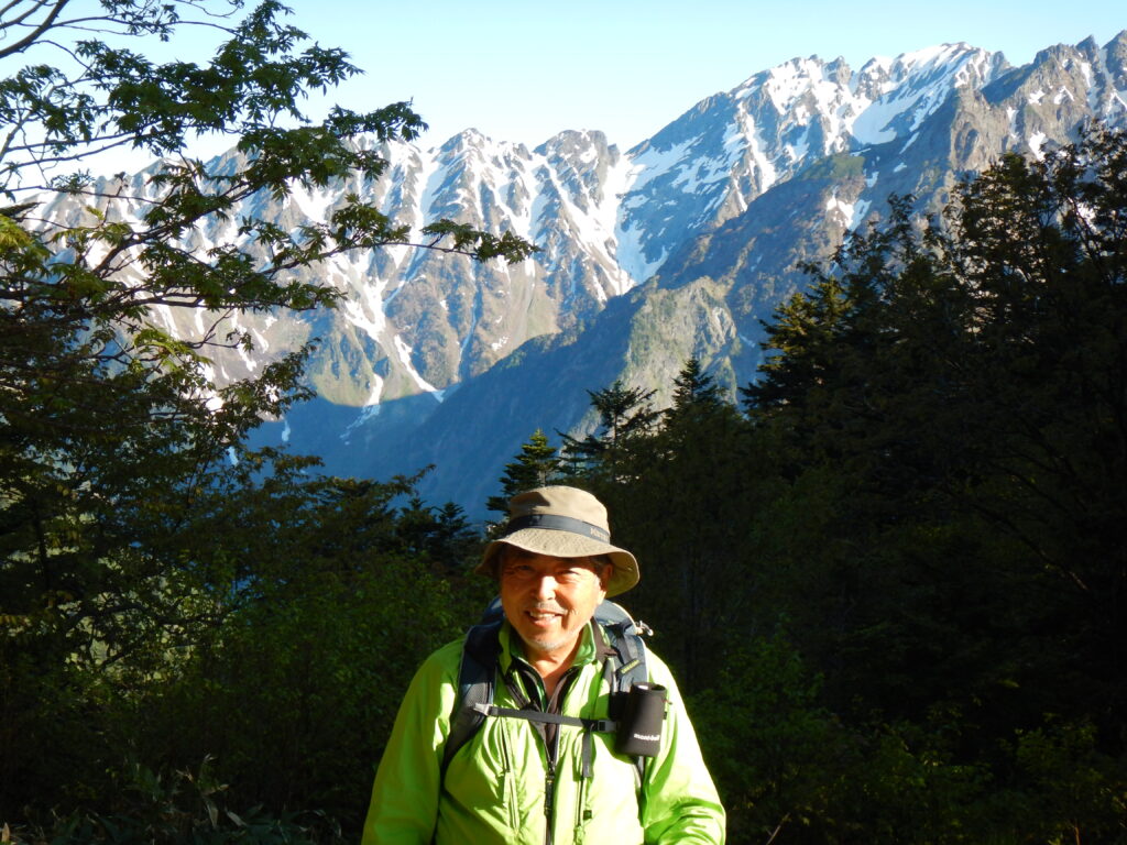 前日島々宿に泊まって1日上がりで徳本峠小屋に着きました。翌朝残雪の穂高の素晴らしい眺望が楽しめました。私の頭の上のコルが天狗のコルで、白い天狗沢が突き上げています。稜線の右から左は順番に天狗岩の頭、間ノ岳、西穂高です。天狗のコルから右へは黒い畳岩の稜線を辿るとコブ尾根の頭、ジャンダルム、その右の小さな突起が片方しかないけれどロバの耳でそこから馬の背を辿れば奥穂高です。この稜線は複雑で遠望しても実際に辿っていないと突起は特定できないでしょう。