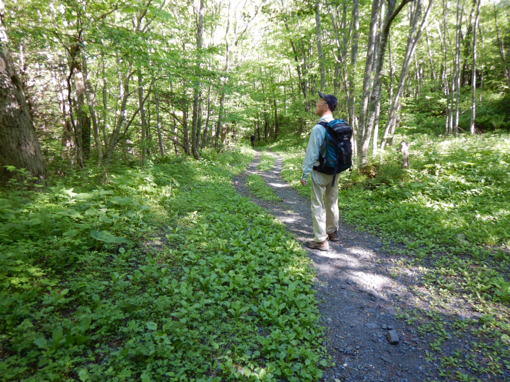 徳本峠から梓川を目指して下ってくると、地中ブナや白樺の樹林に出会います。新緑の季節は息も止まるほどの美しさです。足元には二輪草の群落が広がっています。