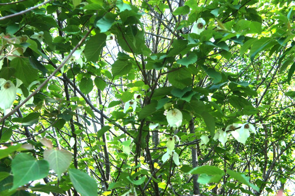 ナンジャモンジャに隠れて、これまた珍しい「ハンカチの木」がありました。「ハンカチの木」はミズキ科の落葉広葉樹で花は花弁がなく2枚の大きな苞が花弁を包むように咲きます。この白い大きな苞がハンカチに似ていることからなずけられました。